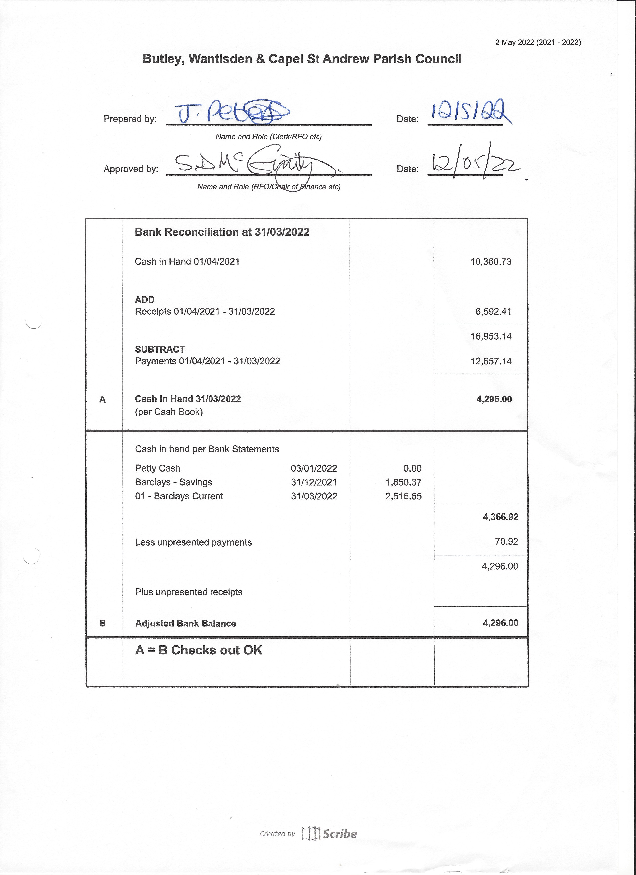 March 2022 Bank Reconciliation - Click Here